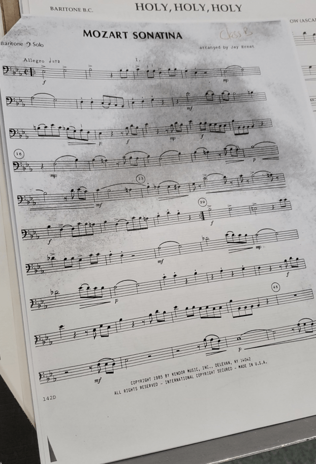 第二节乐队课今天是自由活动,因为四月份有solo比赛,所以老师给大家这节课的时间去自由练习,也可以找我们乐队老师一对一辅导几分钟看看要什么要改进或者是加强的地方。(我乐队老师和上面的学生领导课是一个老师)我的参赛曲目是《Mozart Sonatina》这是一首class b的曲目,总体来说不是很难。对于国内一些管乐生来说可能是小菜一碟吧。